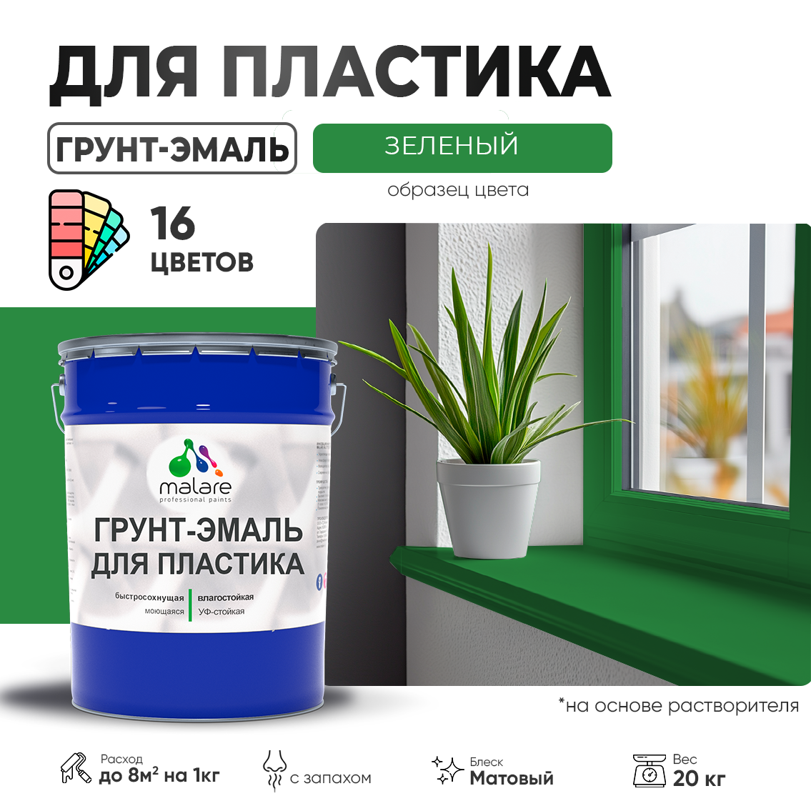 Грунт-Эмаль, Краска Malare 3 в 1 для пластика, окон и подоконников, сайдинга, быстросохнущая, матовый, зеленый, 20 кг. информация: