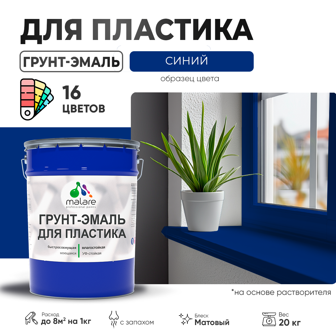 Грунт-Эмаль, Краска Malare 3 в 1 для пластика, окон и подоконников, сайдинга, быстросохнущая, матовый, синий, 20 кг. информация: