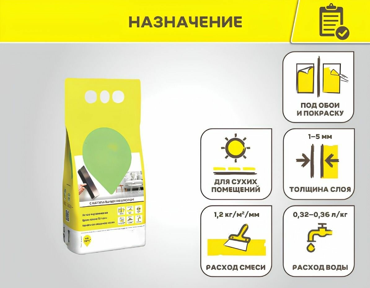 Шпаклёвка финишная, 5 кг, для финишного выравнивания потолков и стен перед покраской или поклейкой обоев информация:
