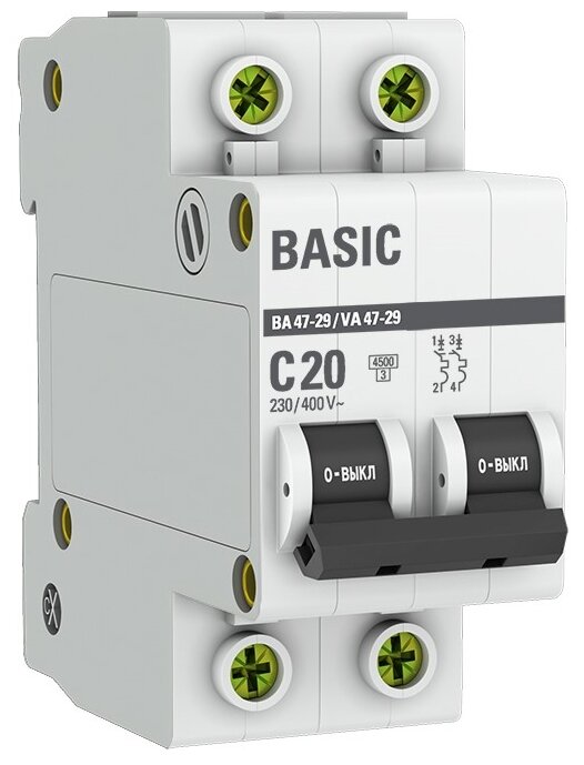 Выключатель автоматический модульный 2п C 20А 4.5кА ВА 47-29 Basic, EKF MCB4729-2-20C (1 шт.)