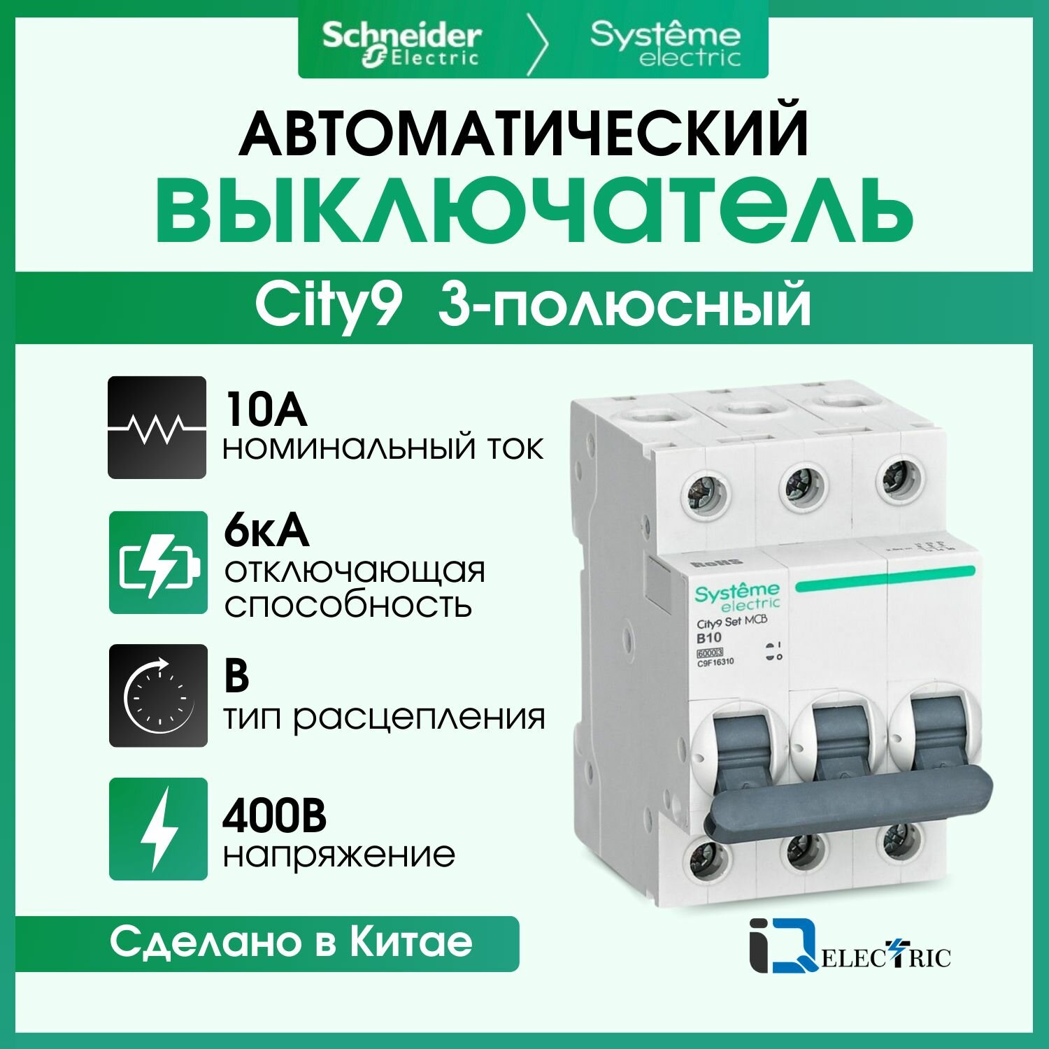 Выключатель автоматический трехполюсный (АВ) B 10А 3P 6kA 400В City9 Set, SCHNEIDER ELECTRIC C9F16310 (1 шт.) информация: