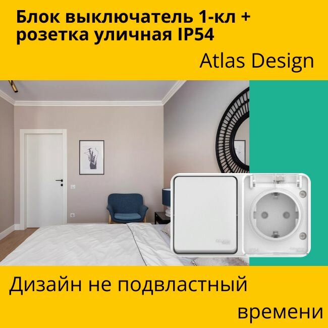 Блок выключатель + розетка уличная IP54, пылевлагозащищенная электрическая 1-клавишная Schneider Electric (Systeme Electric) Atlas Design с заземлением, с защитными шторкми, 16А, Белый - 2 шт. 3 767 ₽