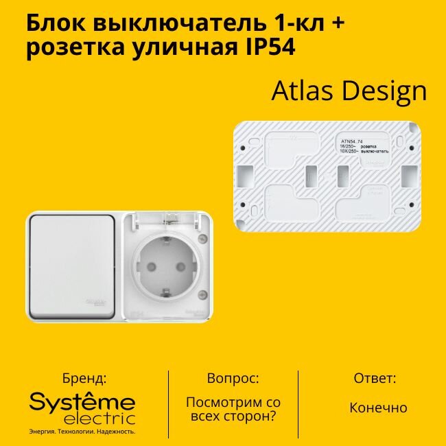 Блок выключатель + розетка уличная IP54, пылевлагозащищенная электрическая 1-клавишная Schneider Electric (Systeme Electric) Atlas Design с заземлением, с защитными шторкми, 16А, Белый - 10 шт. 15 511 ₽