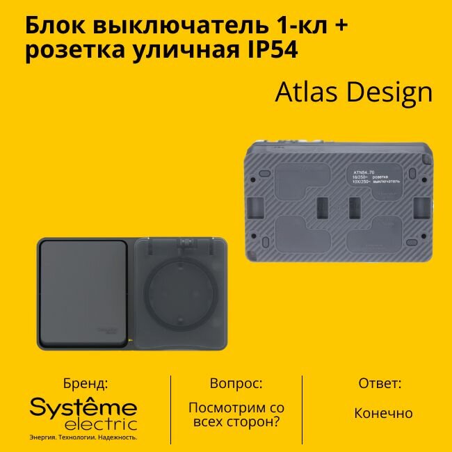 Отзывы на Блок выключатель/розетка 1-клавишная Systeme Electric AtlasDesign с заземлением, с защитными шторкми, Антрацит - 1 шт