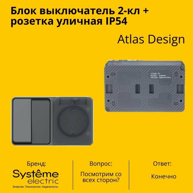 Блок выключатель + розетка уличная IP54, пылевлагозащищенная электрическая 2-клавишная Schneider Electric (Systeme Electric) Atlas Design с заземлением, с защитными шторкми, 16А, Антрацит - 10 шт. 19 324 ₽