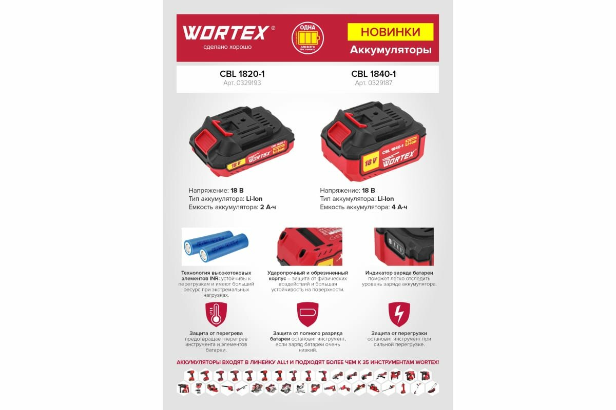 WORTEX Аккумулятор CBL 1840-1 18.0 В 4.0 Ач Li-Ion ALL1 0329187 8 599 ₽