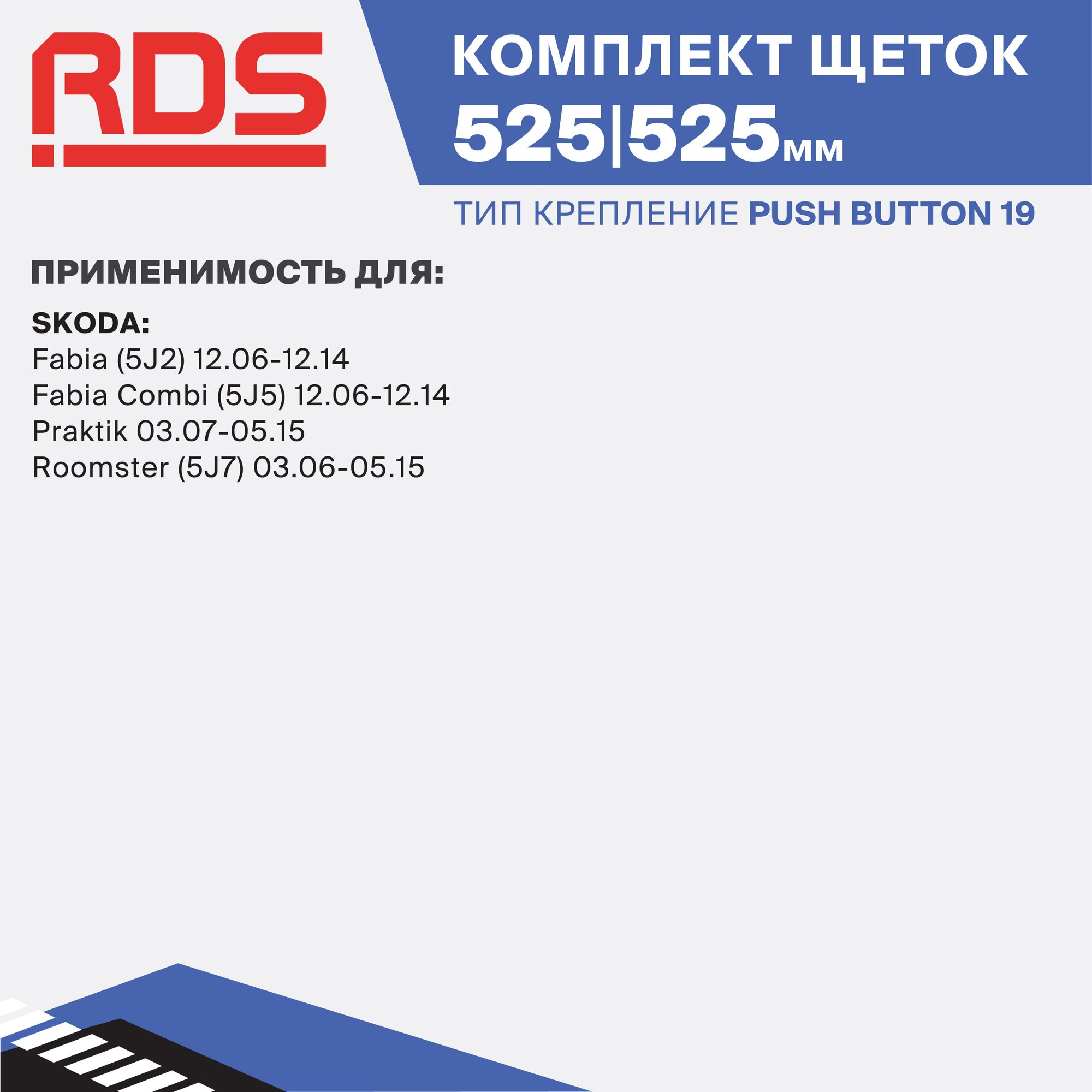 Отзывы на 525 525 мм. Крепление push button 19мм. Комплект бескаркасных щеток стеклоочистителя RD5 дворники на Skoda Fabia; Шкода Фабия; Skoda Fabia Combi; Шкода Фабия Комби; Skoda Praktik; Шкода Практик; Skoda Roomster; Шкода Румстер