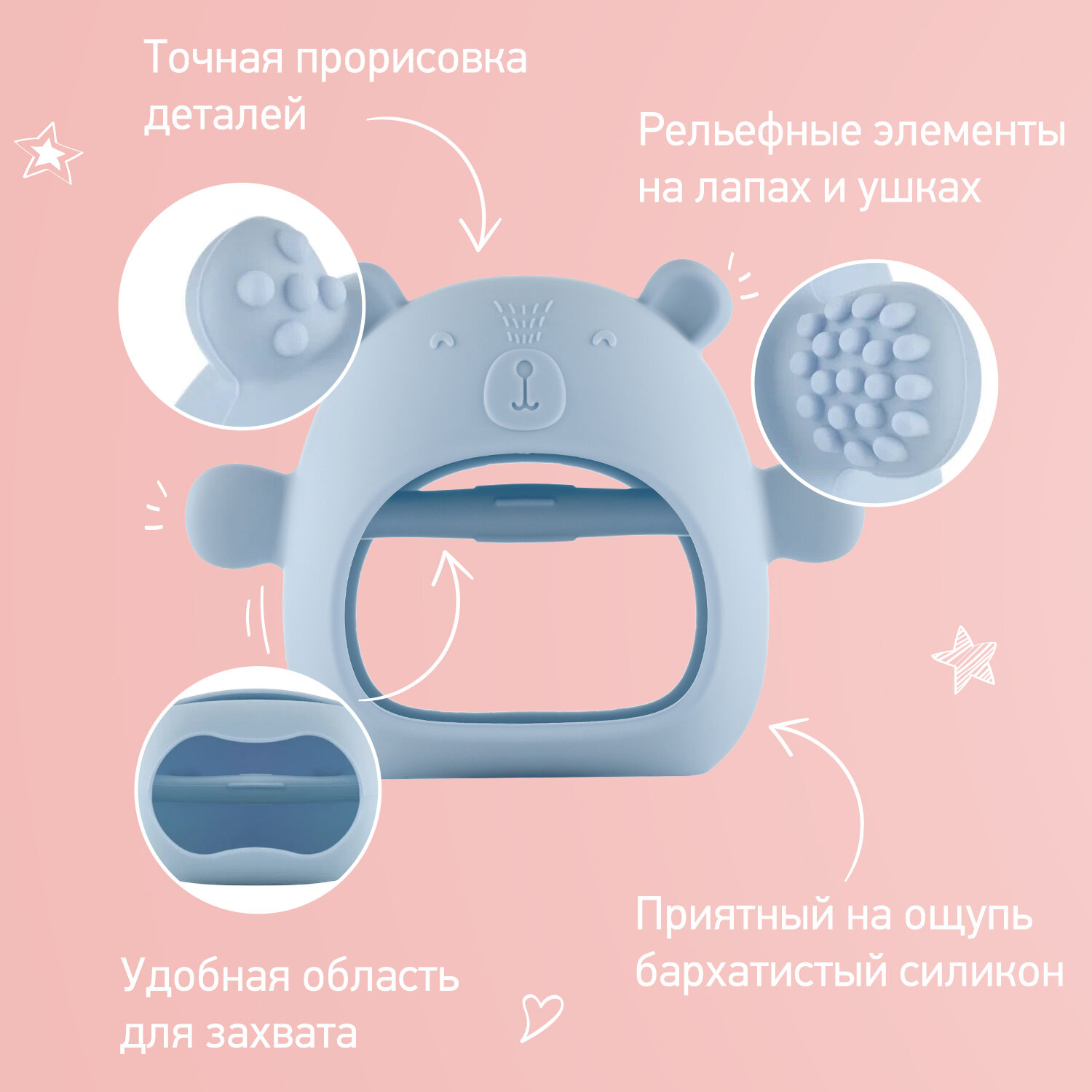 | Развивающие элементы | прорезыватель, тактильные вставки |