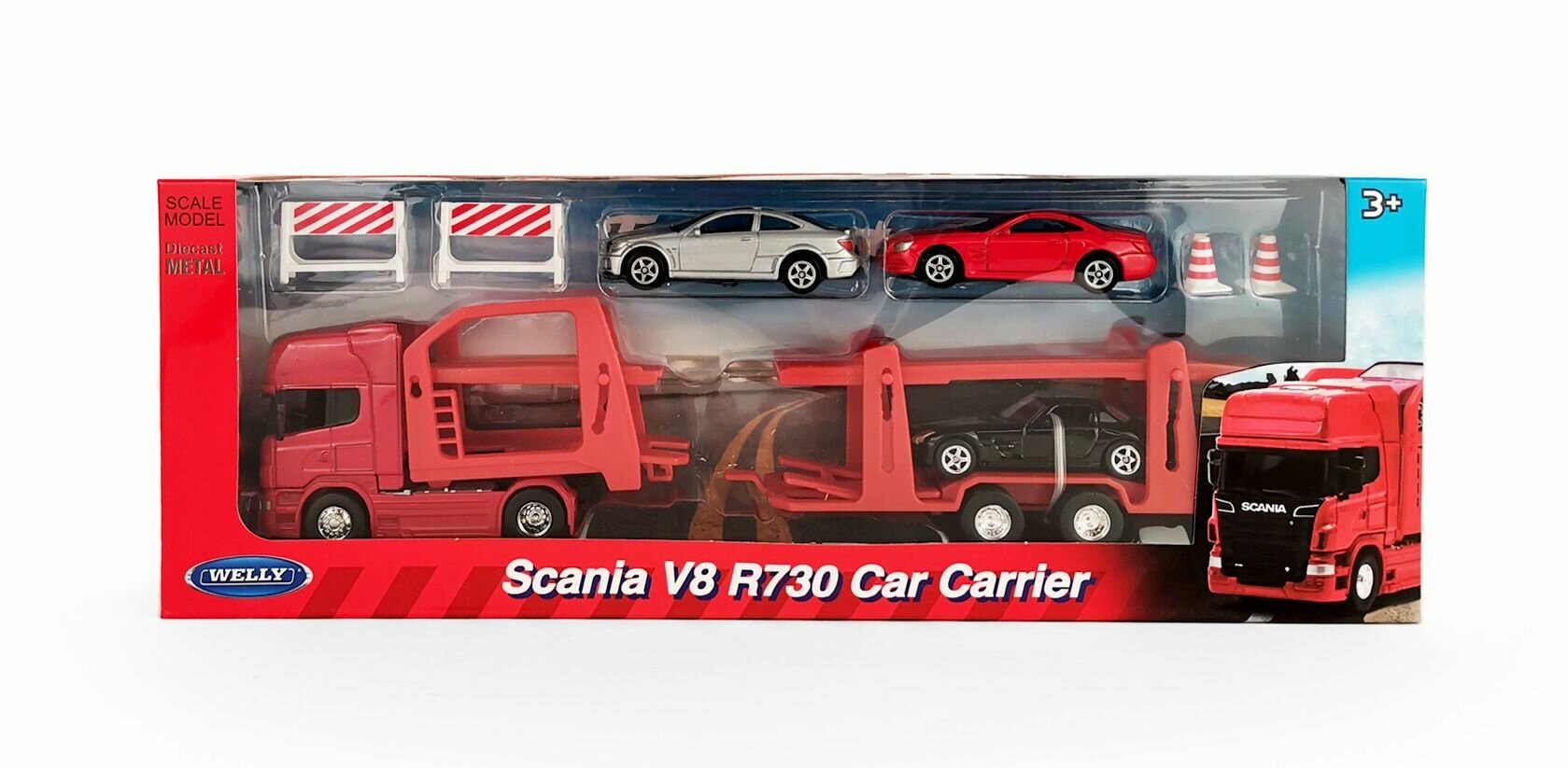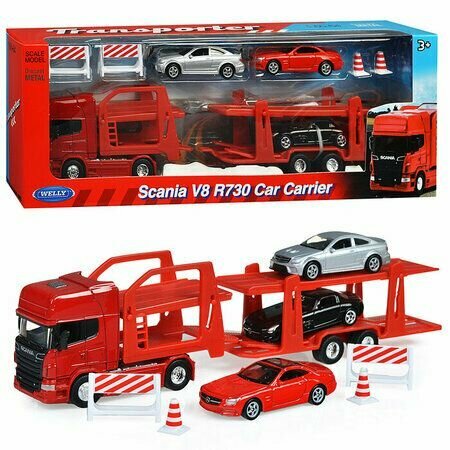 Отзывы на Набор машин WELLY 1:64, Грузовик Scania V8 R730 с тремя легковыми машинками