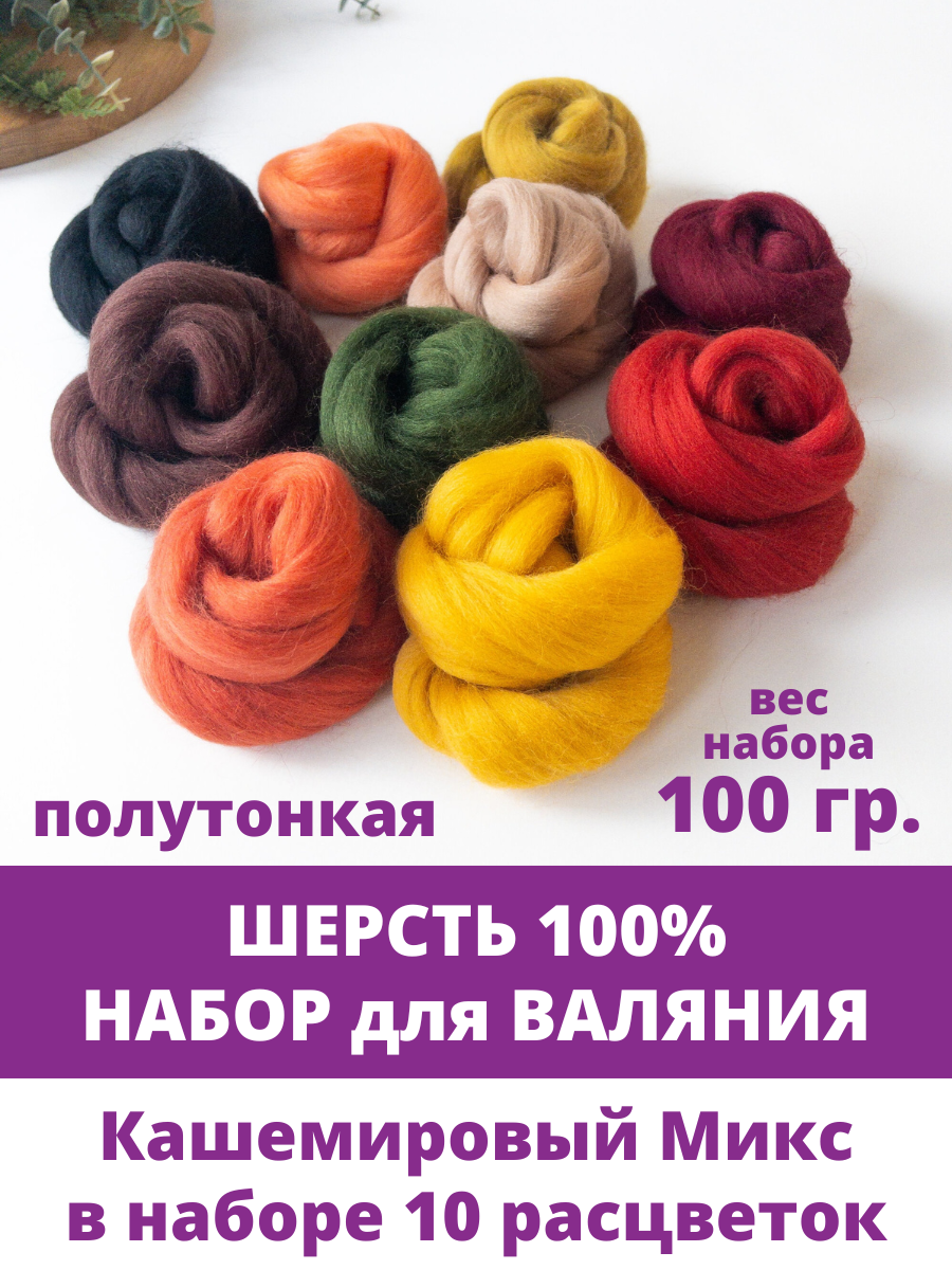 Шерсть для валяния, полутонкая шерсть 100 %, Кашемировый Микс, набор 10 цветов, 100 г информация: