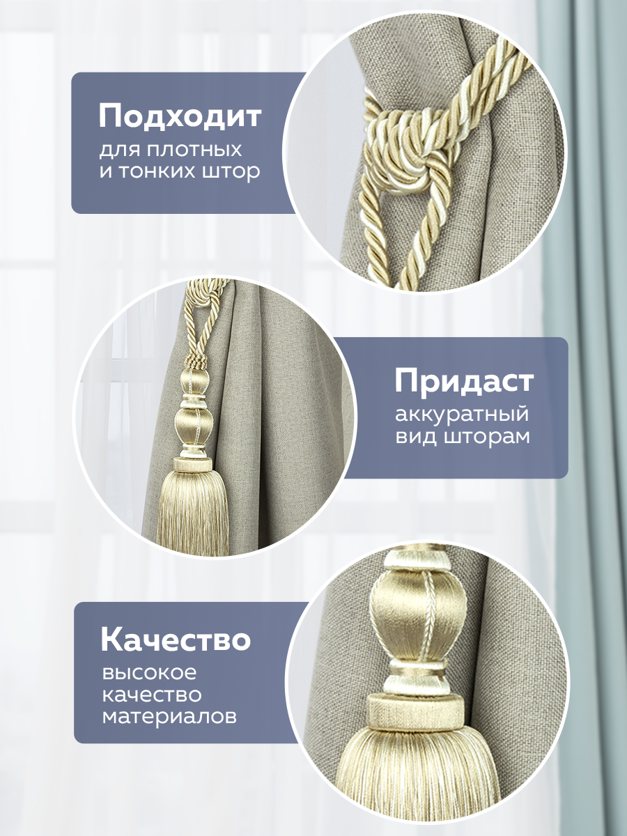 Отзывы на Подхват для штор "Кисть" от бренда Mirtex, модель светло-золотая/молочная, 1 штука