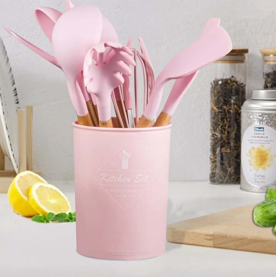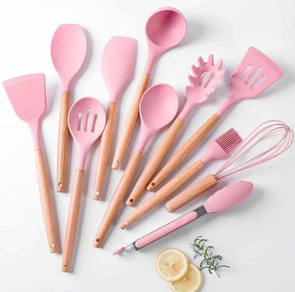 Набор кухонных принадлежностей из бука и силикона, 12 предметов -Идеальный подарок, розовый