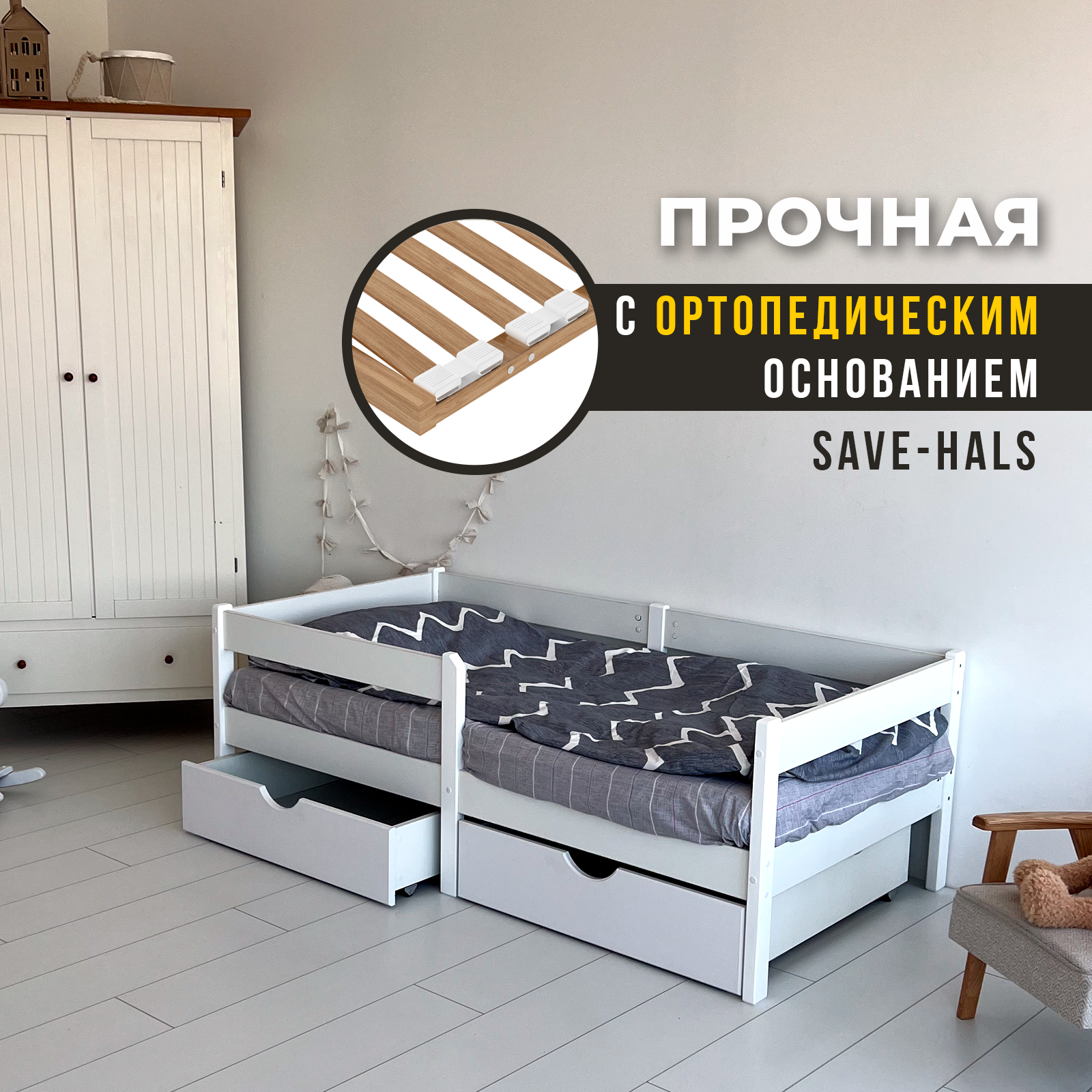 | Особенности | для детей, основание под матрас, с бортиком, с ящиком для белья, усиленная конструкция |