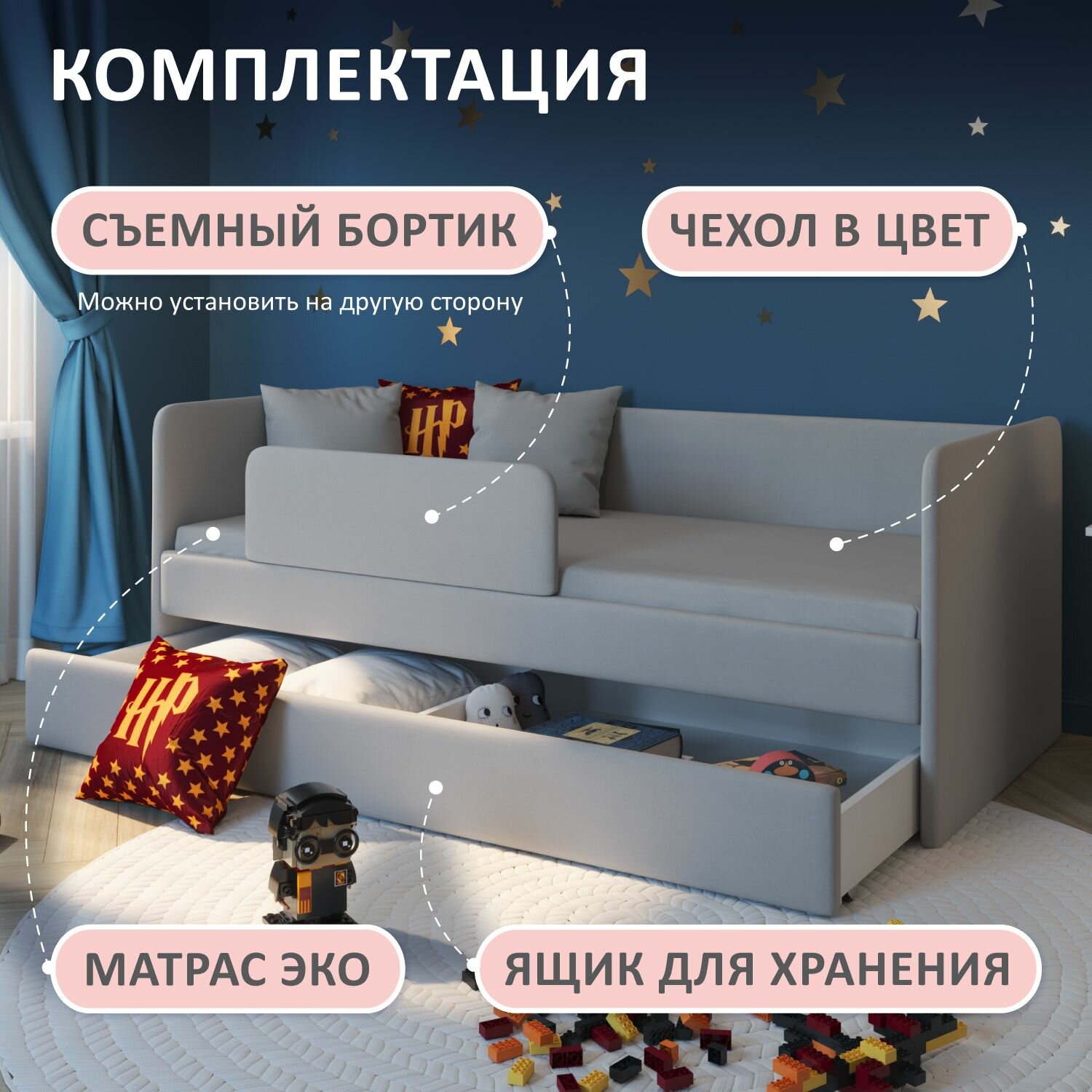 Кровать детская 180х80 см Jenny Серый пух, с матрасом, ортопедическим основанием, защитным бортиком, чехлом на матрас и ящиками для белья. информация: