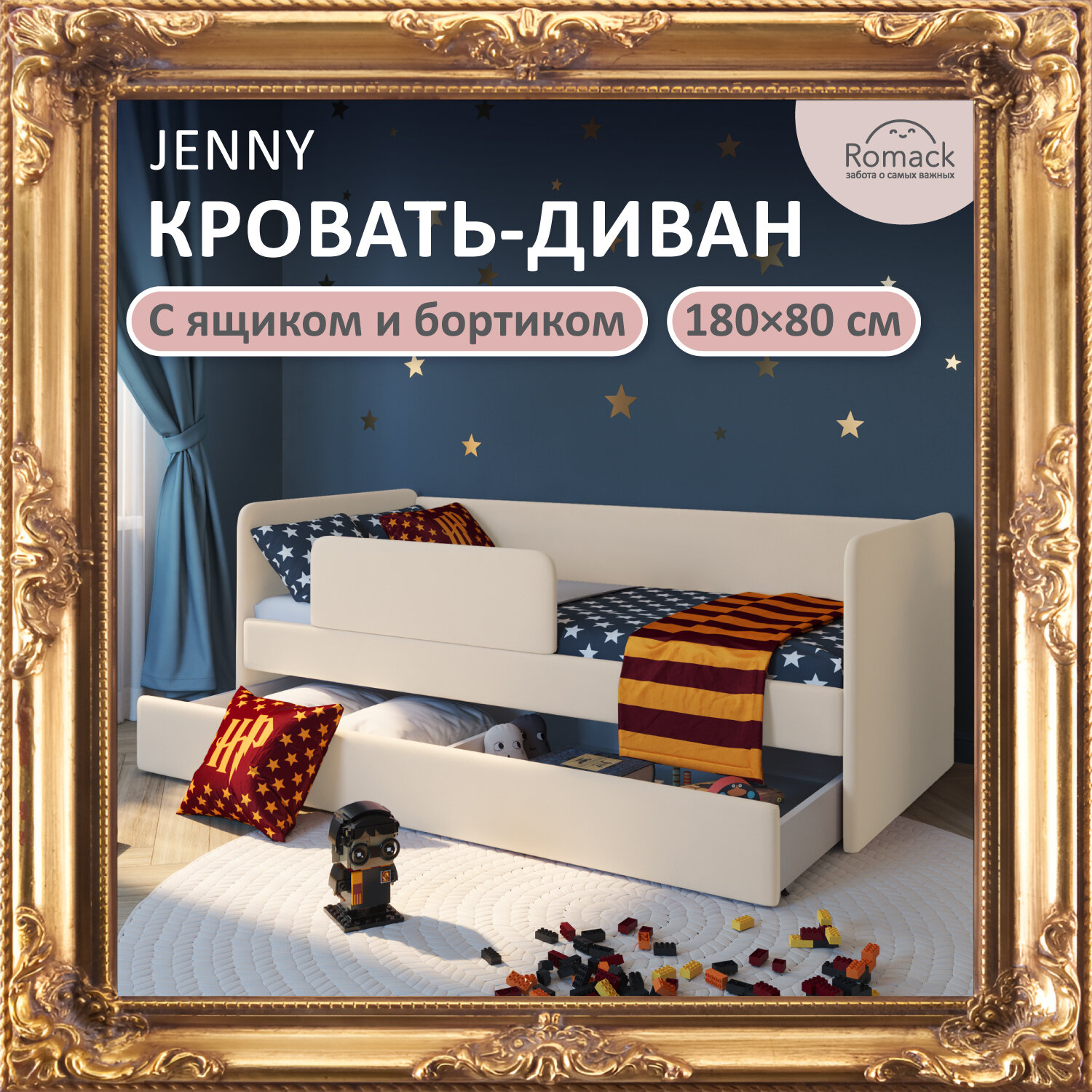 Кровать детская 180х80 Romack Jenny с бортиком и ящиком, с мягким изголовьем, цвет: светло-бежевый микровелюр информация: