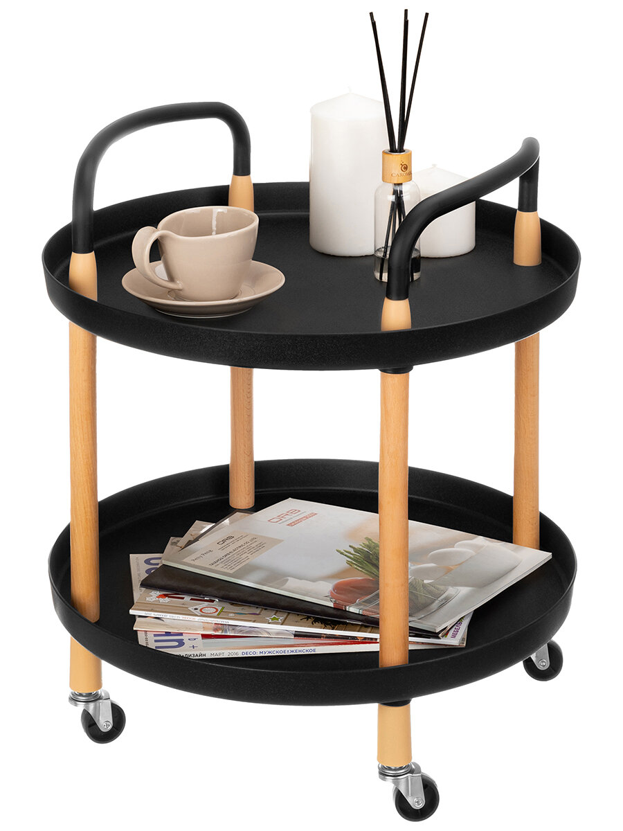 | Дополнительная информация | Этажерка-столик 2-х ярусный сервировочный "Черная" 47,5х47,5х53 см, на 4-х колесиках, 2 колесика с фиксаторами, высота без ручек 43 см, размер каждого яруса 47,5х47,5х3,5 см, расстояние от пола до нижнего яруса 11 см, расстояние между ярусами 27,5 см, максимальная нагрузка на каждый ярус 5 кг |