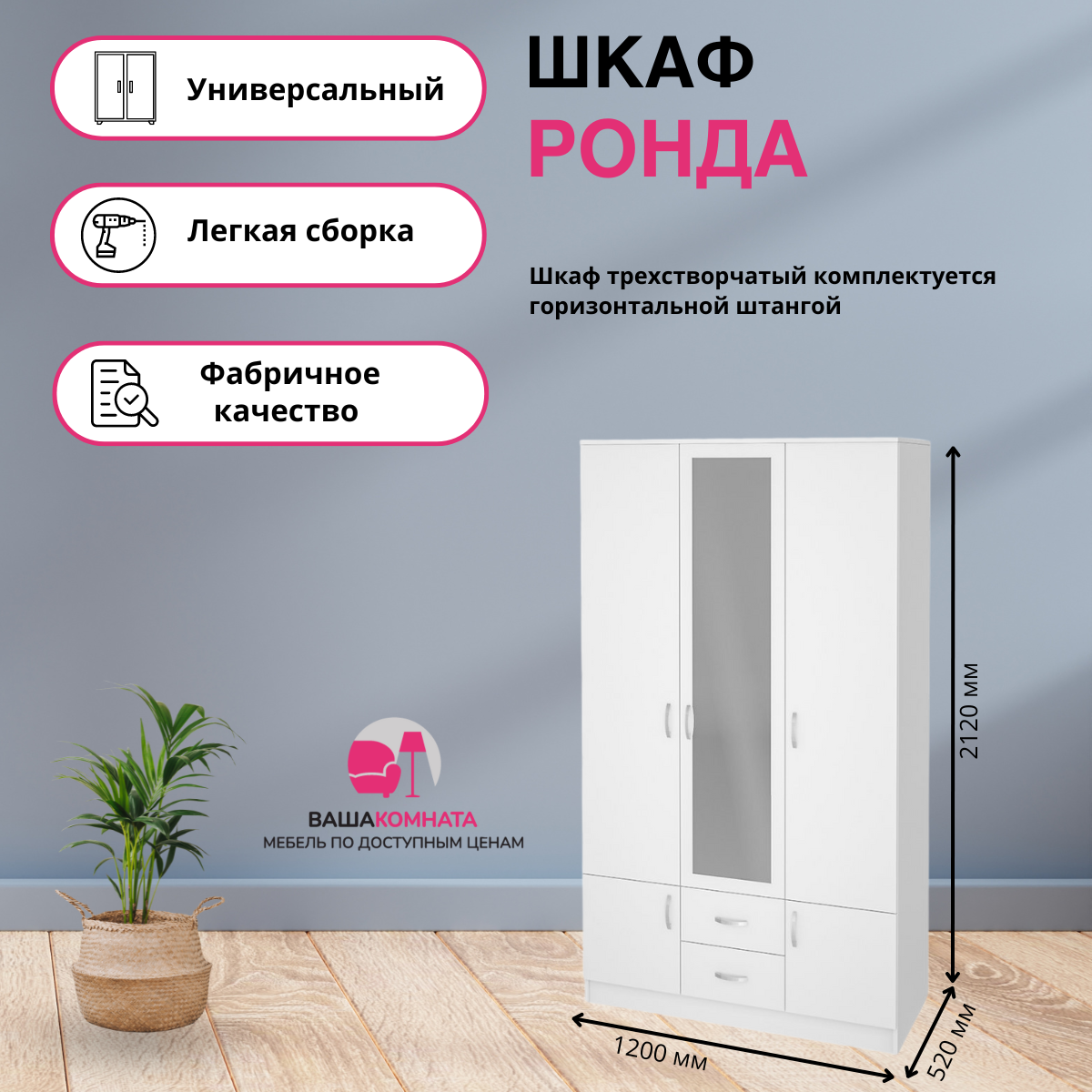 10 цен на Шкаф 3-створчатый ШК-3 "ронда" (Улучшенная фурнитура) - белое дерево
