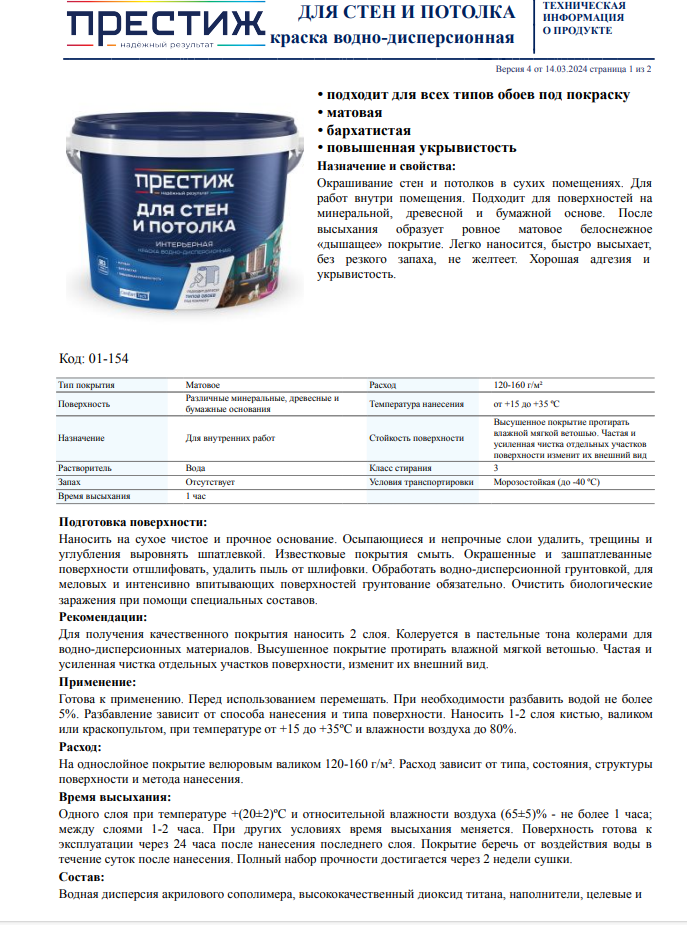 Отзывы на Краска для стен и потолка Престиж, акриловая, 4,5 кг, цвет: белый, матовая