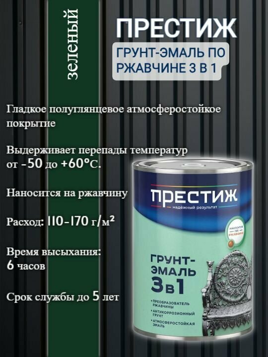 Отзывы на Грунт-эмаль по ржавчине 3 в 1 Престиж М, полуматовая, 0,9 кг, зеленая, 1шт, металлическая банка