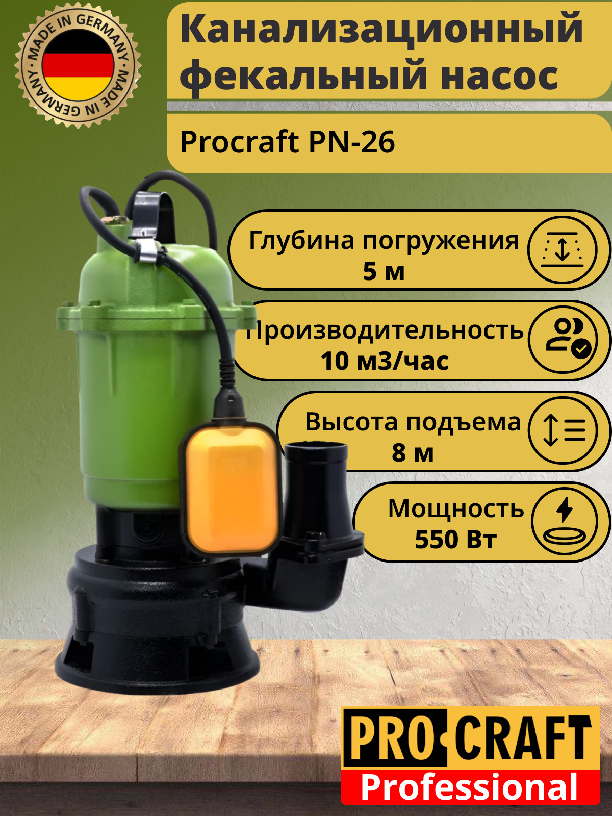 Отзывы на Канализационный фекальный насос с поплавковым выключателем Procraft PN-26 ( 10000 л/мин, погружение 5м, напор 8м )