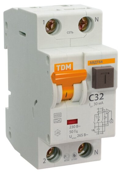 Дифференциальный автоматический выключатель Tdm Electric АВДТ 64, 2Р(1Р+N), C32, 30 мА, 6 кА, тип А