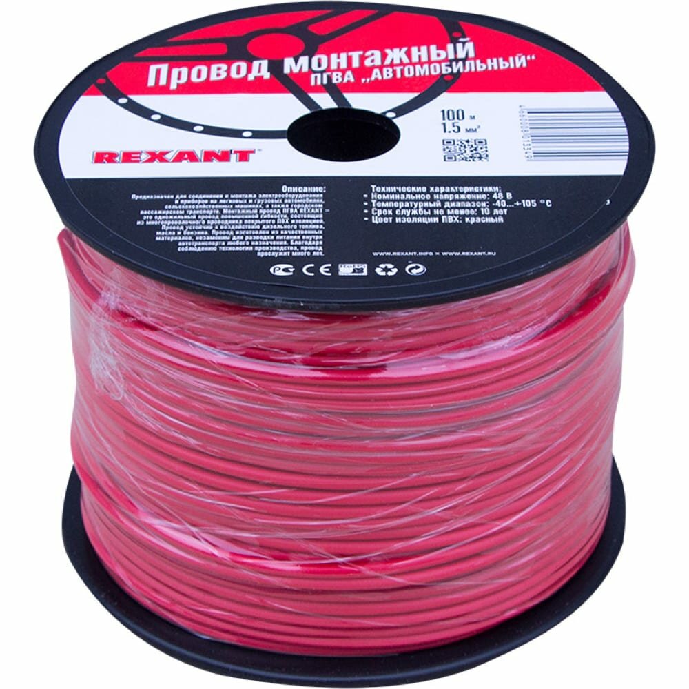Провод автомобильный красный REXANT ПГВА, сечение кабеля 1,5 мм, длина 100м, акустический кабель информация:
