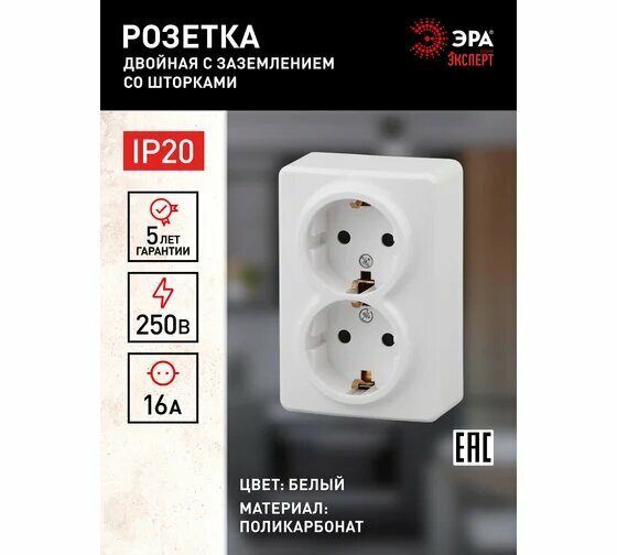 10 цен на 11-2206-01 11-2206-01 ЭРА Розетка 2х2P+E Schuko со шторками, 16A-250В, IP20, ОУ, Эра Эксперт, белый, цена за 1 шт