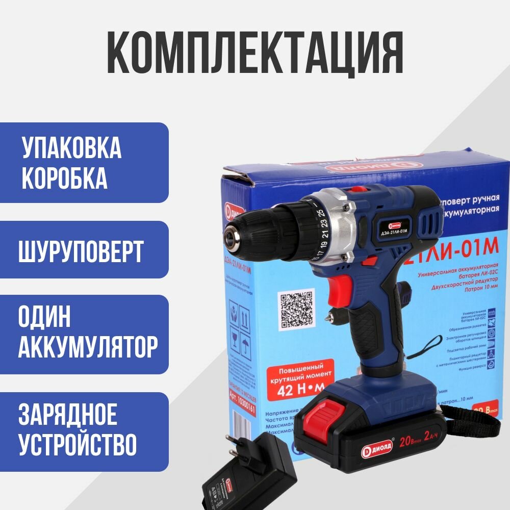 Дрель/шуруповерт аккумуляторный ДЭА-21ЛИ-01М диолд, 20В, 1 АКБ - 2А информация: