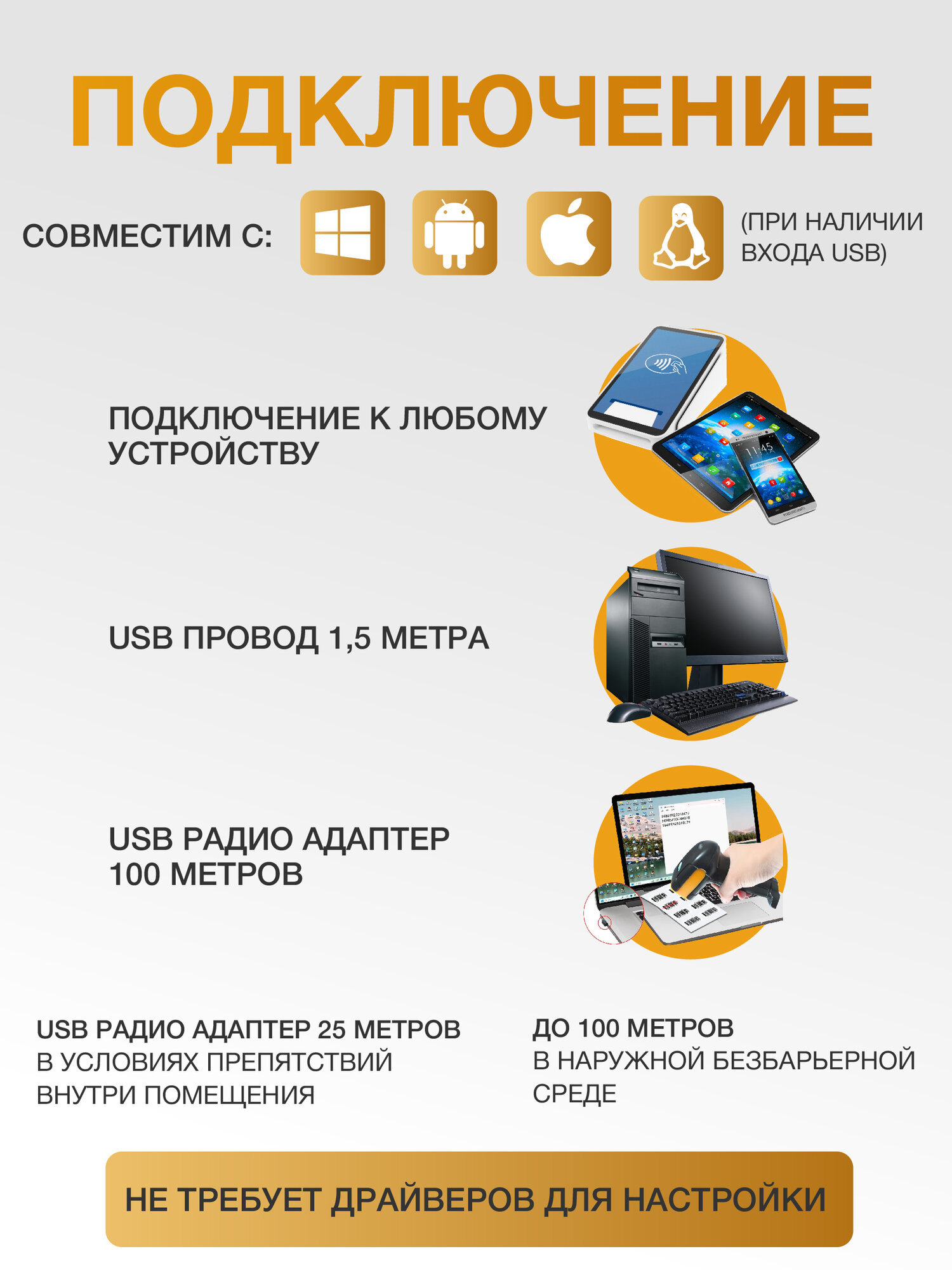 | Комплектация | Сканер штрих-кодов, кабель, USB приемник, коробка, русская инструкция, OTG адаптер Type-C |