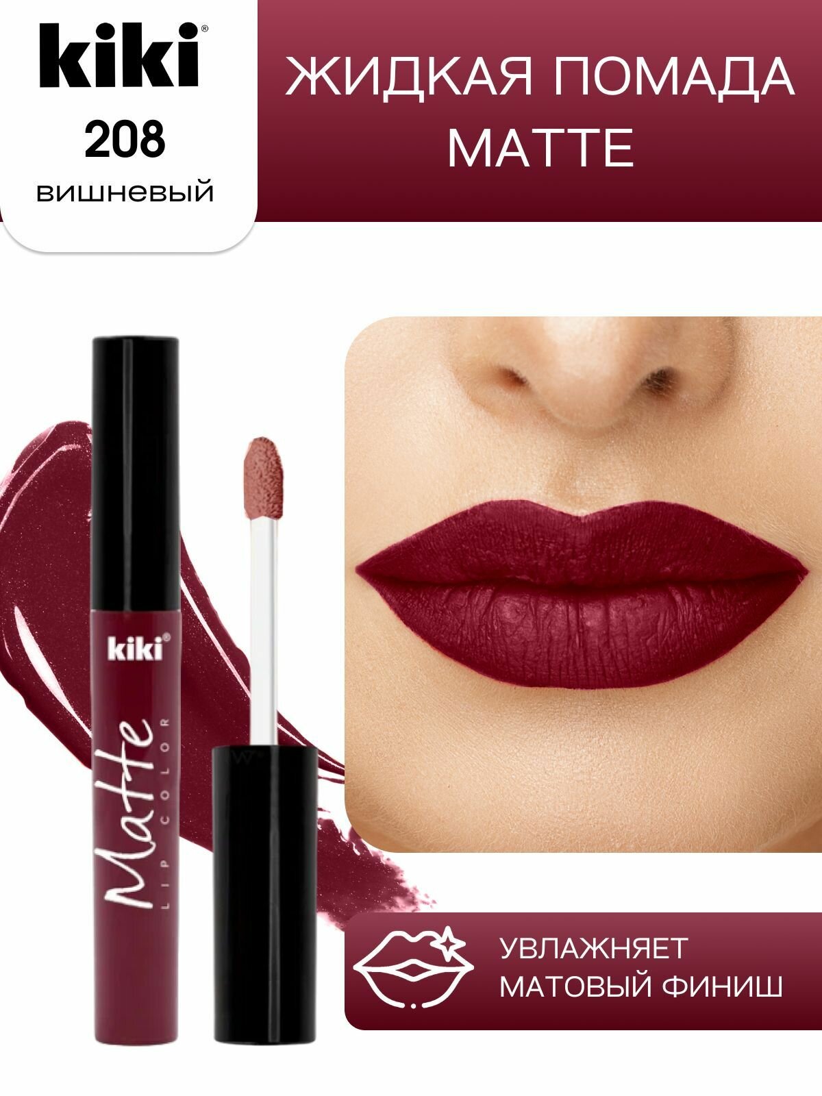 10 цен на Жидкая помада для губ kiki Matte lip color тон 208 вишнёвый стойкая увлажняющая матовая с маслом жожоба и витамином Е , кики