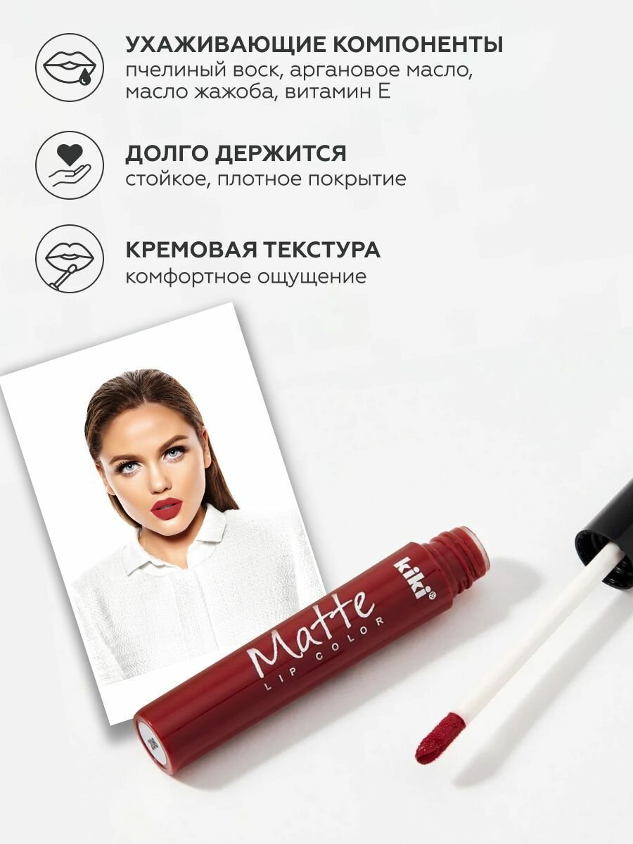 10 цен на Жидкая помада для губ kiki Matte lip color тон 206 каштаново-коричневый стойкая увлажняющая матовая с маслом жожоба и витамином Е , кики