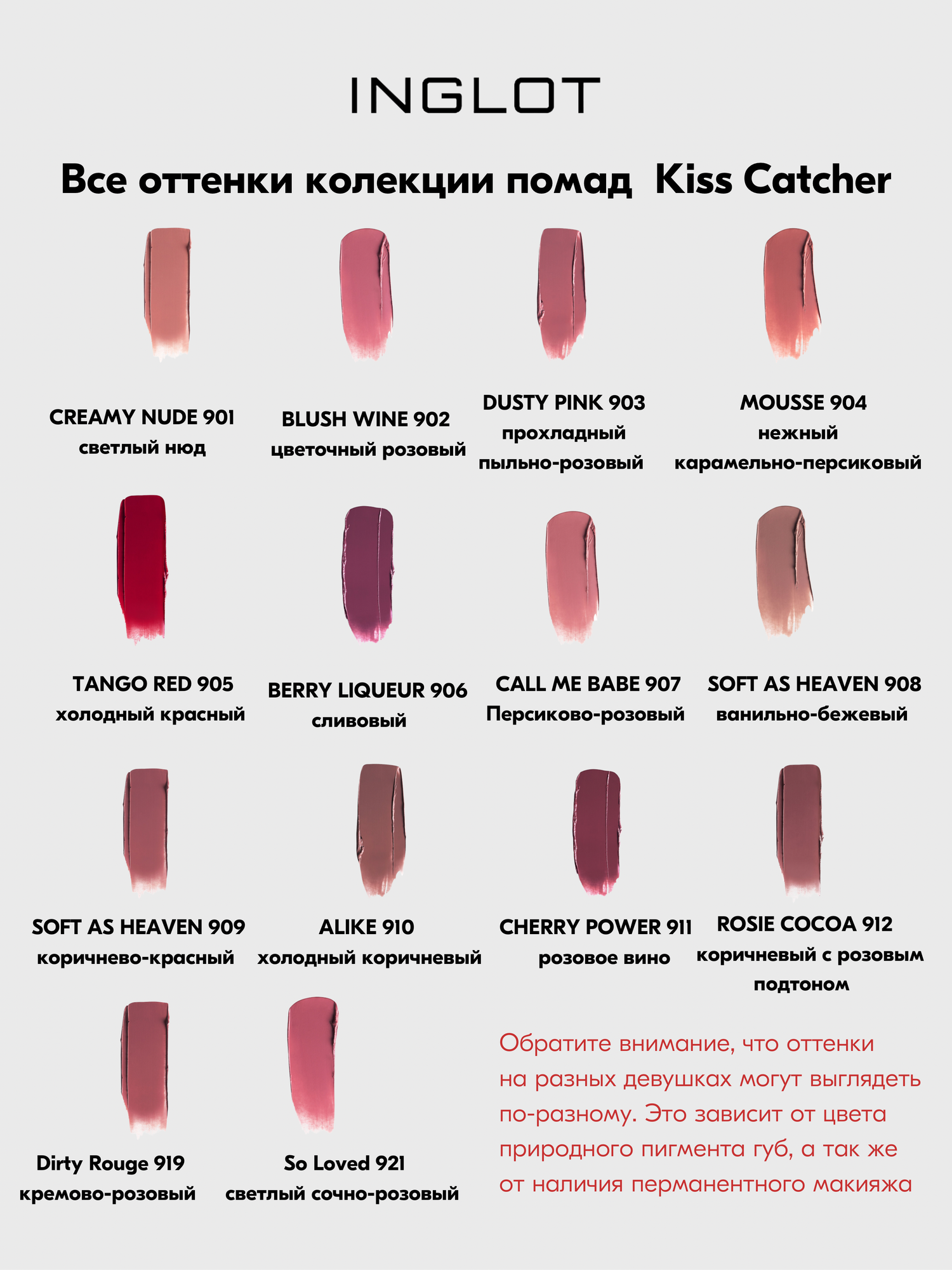| Цвет товара | №901 CREAMY NUDE, №902 BLUSH WINE, №903 DUSTY PINK, №904 Peach Mousse, №905 TANGO RED, №906 BERRY LIQUEUR, №907 CALL ME BABE, №908 SOFT AS HEAVEN, №909 MADAME BLOSSOM, №910 63 ALIKE, №911 CHERRY POWER, №912 ROSIE COCOA, №919 DIRTY ROUGE, №921 SO LOVED |