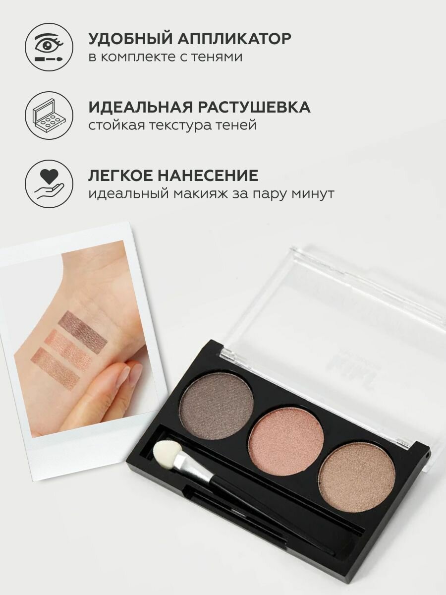 Тени для век kiki Shadow Trio Collection Color тон 101 стойкая палетка 3 цвета с аппликатором для растушевки молочный шоколад корица золотисто-коричневый, кики 167 ₽