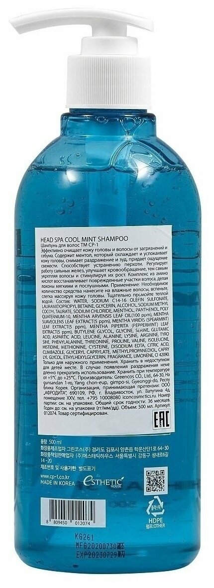 ESTHETIC HOUSE Охлаждающий корейский шампунь с мятой / Корейский шампунь для жирных и нормальных волос бессульфатный, успокаивающий кожу головы CP-1 Head Spa Cool Mint Shampoo, 500 мл информация: