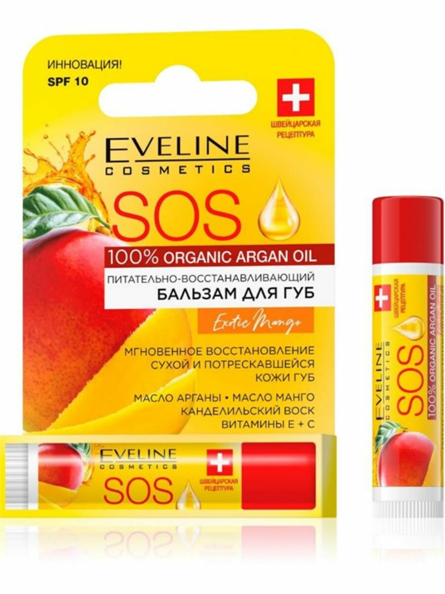 Eveline Cosmetics Бальзам для губ Питательно-Восстанавливающий SOS 100% ORGANIC ARGAN OILEXOTIC MANGO, 4,5 г
