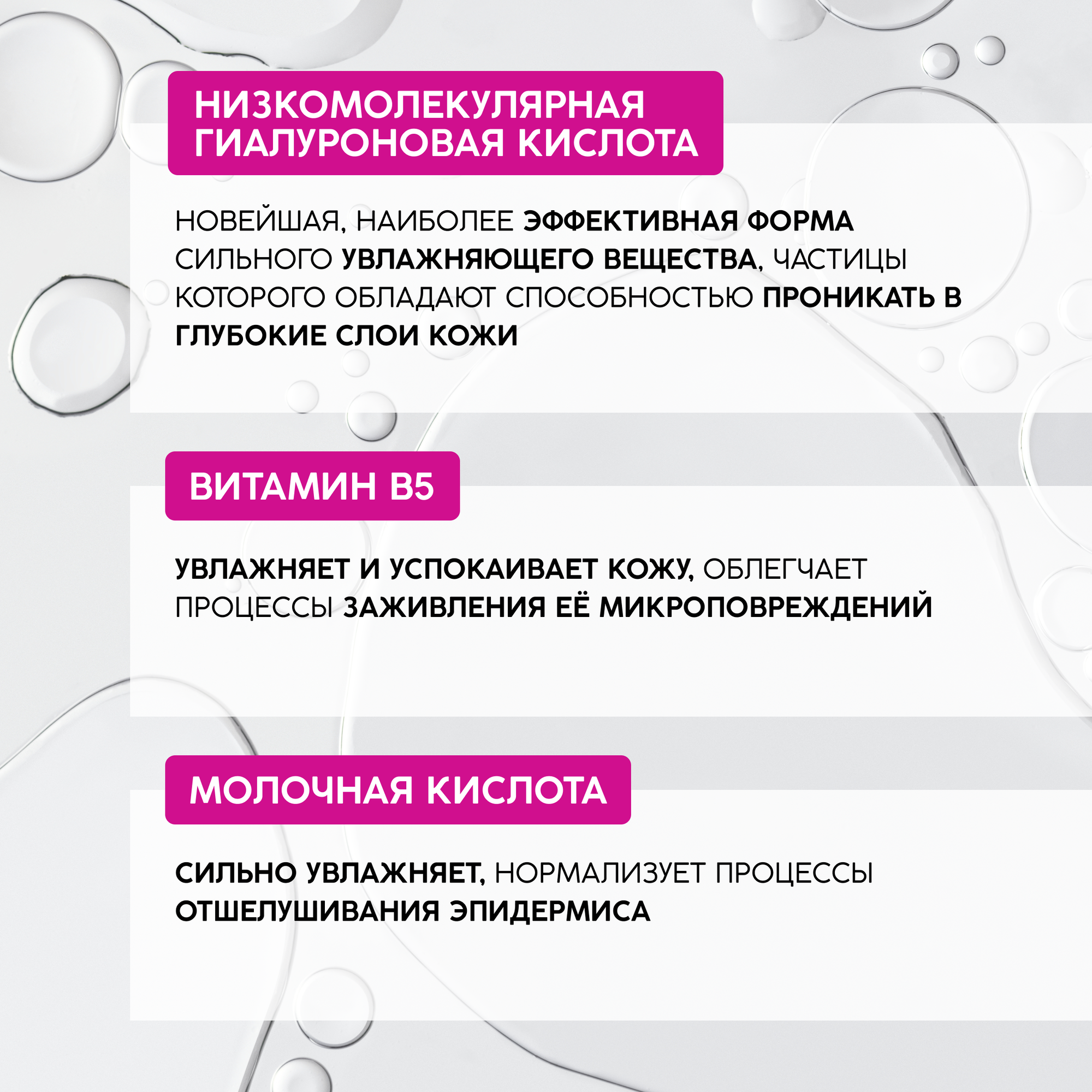 | Состав | Aqua (Water), Glycerin, Panthenol, Arginine PCA, Hyaluronic Acid, Hydrolyzed Glycosaminoglycans, Lactic Acid, Polysorbate 20,Disodium EDTA, Phenoxyethanol, Ethylhexylglycerin, DMDM Hydantoin, Parfum (Fragrance), Butylphenyl Methylpropional, Linalool. |