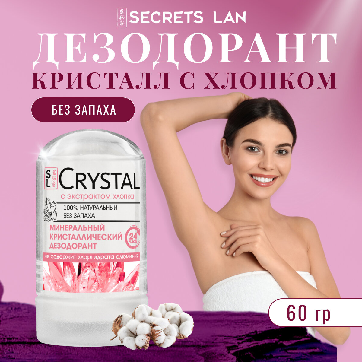 Дезодорант женский Secrets Lan твердый минеральный кристалл Алунит с экстрактом хлопка информация: