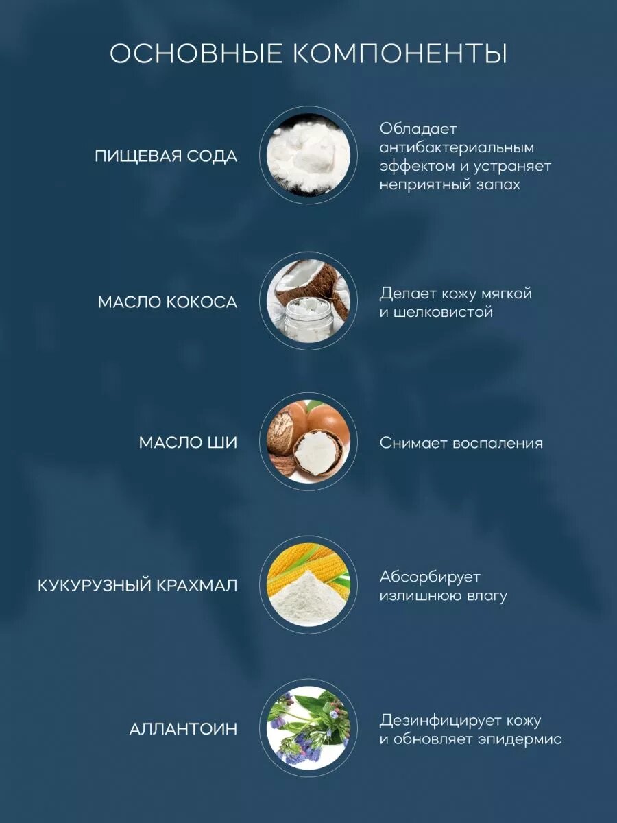 Полный состав | Sodium Bicarbonate (Сода пищевая), Corn Starch (Кукурузный крахмал), Cocos Nucifera Oil (Масло кокоса), Butyrospermum Parkii Butter (Масло ши), Cera Alba (Воск пчелиный), Allantoin (Аллантоин), Lavandula Angustifolia Oil (Эфирное маслолаванды), Parfum (Парфюмерная композиция). |