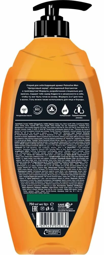 Гель для душа мужской Palmolive MEN Бодрящий Цитрусовый Заряд 2 в 1 для тела и волос, 750 мл информация: