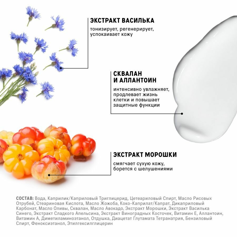 | Cостав | Aqua (Water), Glyceryl Monostearate, Cetylstearyl Alcohol, Isopropyl Miristate, Glycerin, Ethylhexyl Stearate, Caprylic/Capric Triglyceride, Trehalosa, Stearic Acid, Tapioca Starch, Squalane, Triglycerides of linoleic and linolenic acids, Ceteareth-23, Ceteareth-6, Betaine, Oryza Sativa (Rice) Bran Oil, Simmondsia Chinensis (Jojoba) Seed Oil, Persea Gratissima (Avocado) Fruit Extract, Rubus Chamaemorus (Cloudberry) Fruit Extract, Centaurea Cyanus (Cornflower) Flower Extract, Citrus Sinensis (Orange) Peel Extract, Vitis Vinifera (Grape) Seed Extract, Allantoin, Xanthan Gum, Lecithin, Tocopherol, Linoleic Acid, Linolenic Acid, Retinyl Palmitate, Tocopheryl Acetate, Ascorbyl Palmitate, Phenoxyethanol, Retinyl Acetate, Ethylhexylglycerin, Fragrance, Tetrasodium Glutamate Diacetate, Butyl Hydroxytoluene (BHT), Citric Acid |