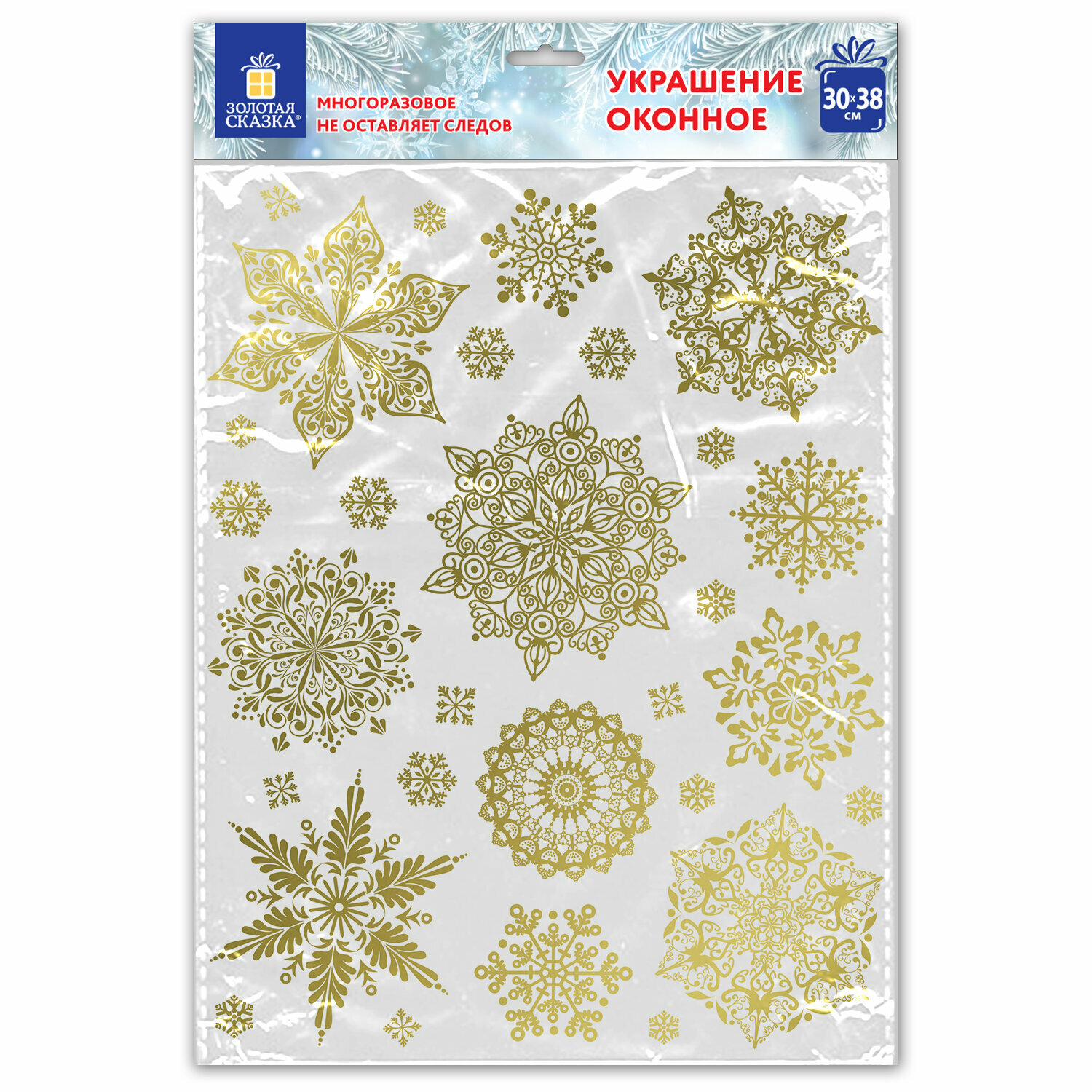 Наклейка для окон Золотая сказка двусторонняя многоразовая, 30х38 см, "Снежинки", фольга, золото информация: