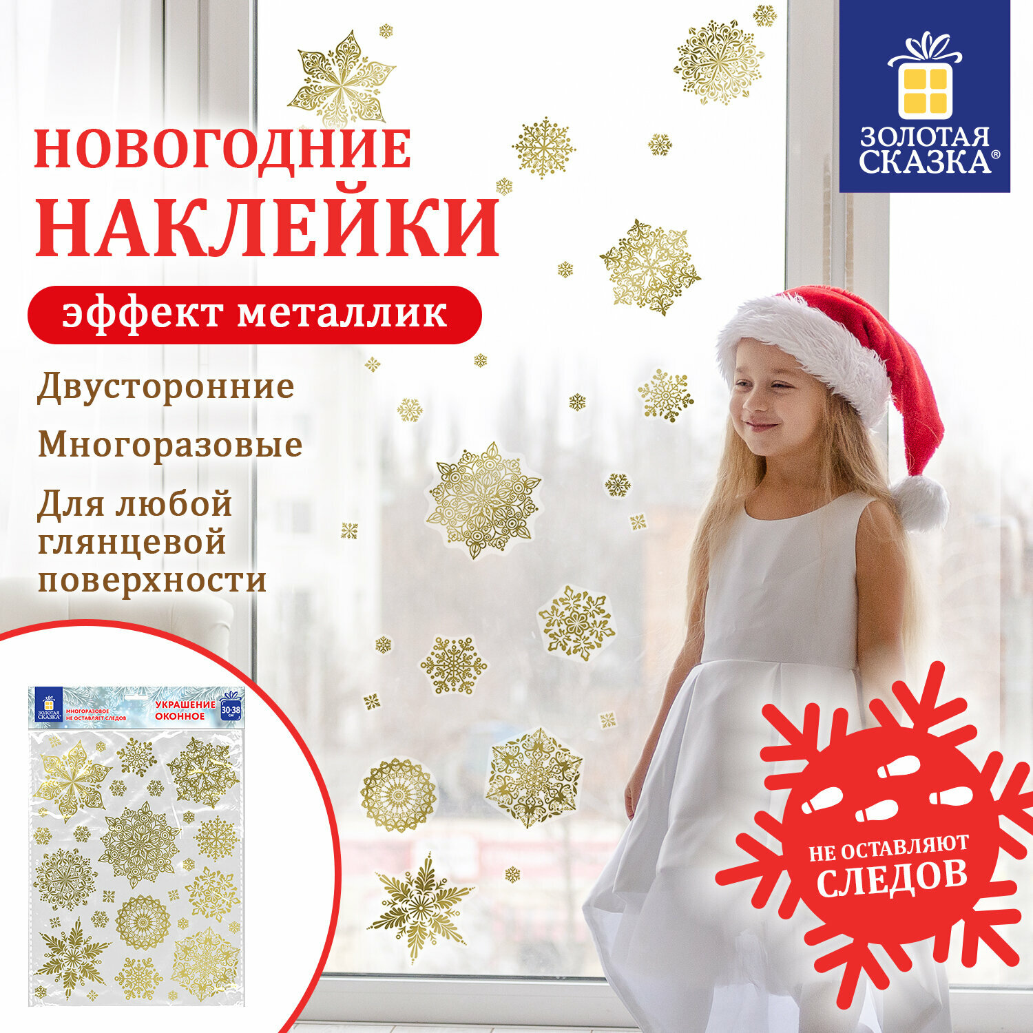 10 цен на Наклейка для окон Золотая сказка двусторонняя многоразовая, 30х38 см, "Снежинки", фольга, золото