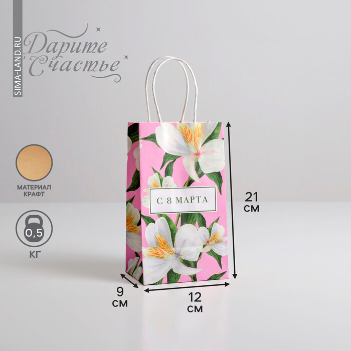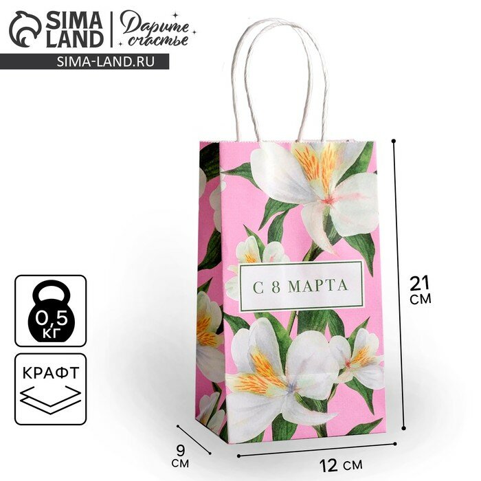 Пакет подарочный крафт С 8 марта, 12 × 21 × 9 см информация: