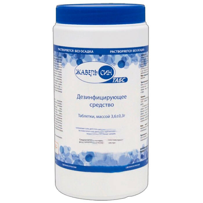 | Дополнительная информация | Хлорные таблетки ЖАВЕЛЬ СИН Табс обладают антимикробным действием в отношении грамотрицательных и грамположительных бактерий (включая микобактерии туберкулеза, возбудителей особо опасных инфекций - чумы, холеры, туляремии, спор сибирской язвы), вирусов (Коксаки, ECHO, полиомиелита, гепатитов А, В, С и др., ВИЧ, гриппа в т.ч. H5NI, HINI, герпеса, аденовирусов и др.), грибов рода Кандида и Трихофитон. |