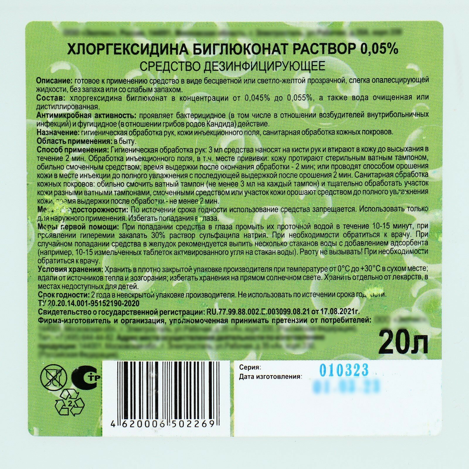 Хлоргексидина биглюконат раствор 0,05% средство дезинфицирующее, 20 л информация: