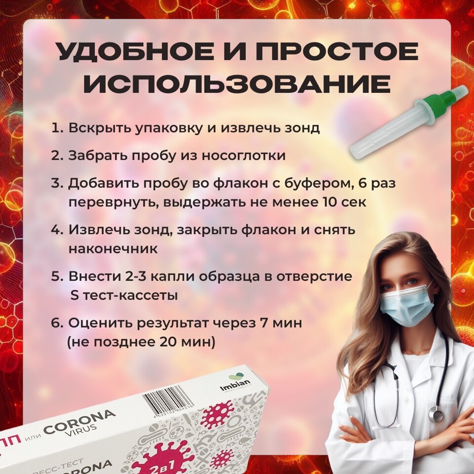 Экспресс-тест на грипп ( 2шт ) тип A/B и COVID-19 антигена коронавируса SARS-CoV-2 в мазках из носоглотки или ротоглотки человека 770 ₽
