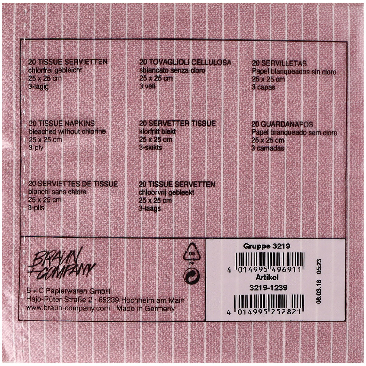 Бумажные салфетки сервировочные "Земляника", розовые (фрезовые, светло-малиновые) в тонкую полоску,1 упаковка 20 шт, 25х25 см, пр-во Германия информация: