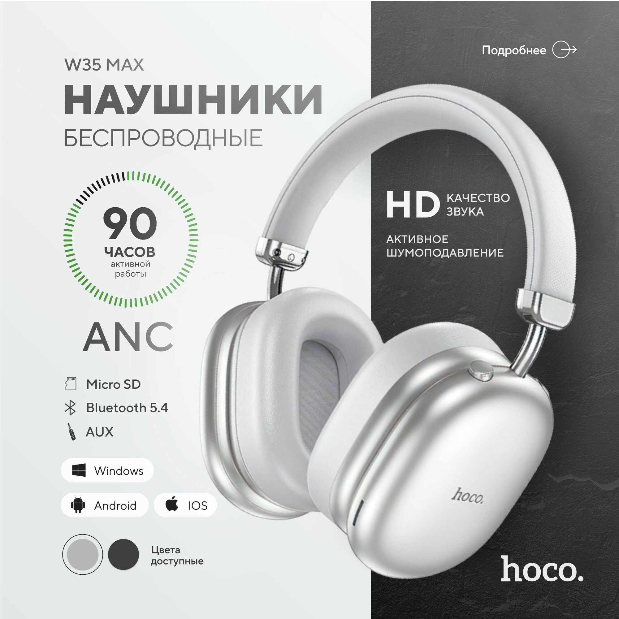 Наушники беспроводные Hoco W35 Max ANC (с шумоподавлением) серебро информация: