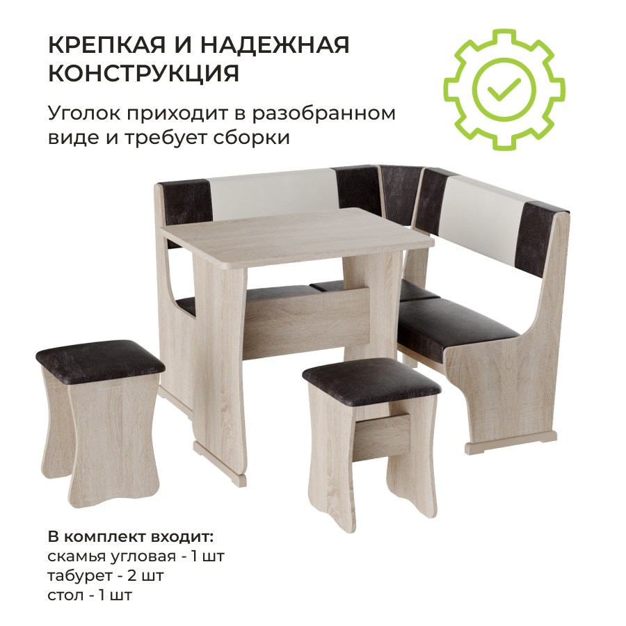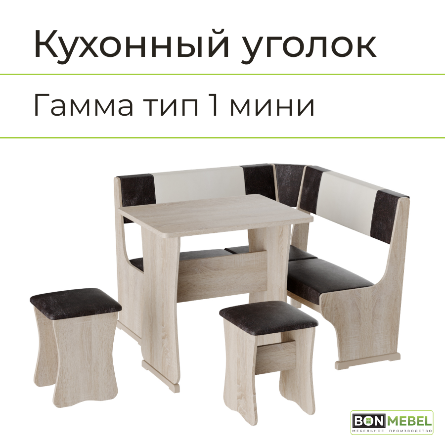 Кухонный уголок BONMEBEL Гамма Тип 1 мини, ЛДСП дуб сонома/КЗ шоколад/беж, стол, диван, табуреты информация: