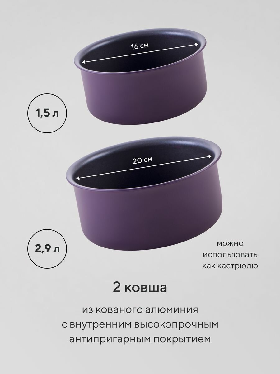 | Комплектация | Состав набора: Глубокая сковорода 24 см – 2,5 л Сковорода 26 см – 2,5 л Ковш 18 см – 1,7 л. |